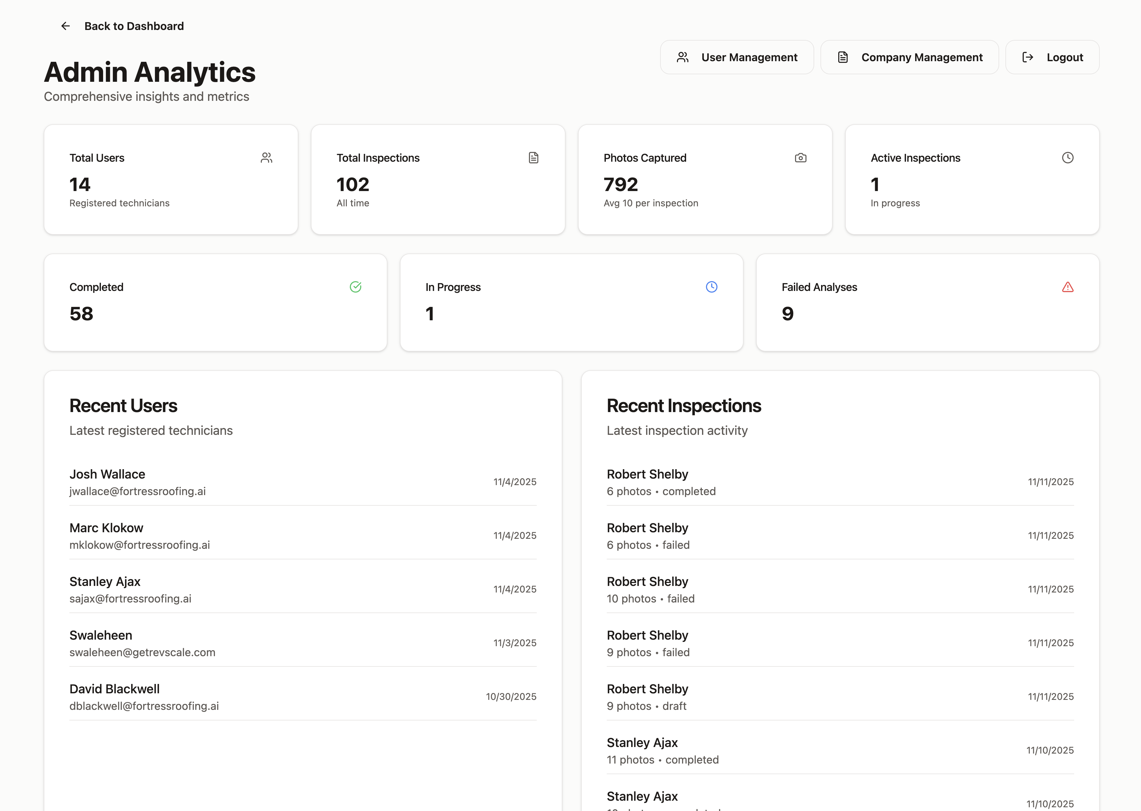 Add your crew, assign roles, see everyone's inspections in one place. Each person logs in and sees only what they need to.